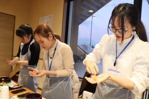 稚内国際文化交流協議会などは18日夕方、副港市場で市内在住の外国人向けに異文化体験講座を開き、参加したベトナム人らが日本の伝統食〝お寿司〟を握った。