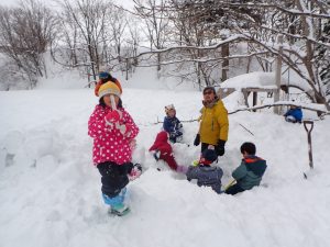上勇知のゆうち自然学校代表を務め、勇知保育所所長として今年で6年目になる伊藤さん(57)が、全国に100カ所近くある自然との関わり方を学ぶ幼児教育団体「森のようちえん」(本部・東京)の理事を務めている関係で、神奈川県から昨冬に続き加藤尚樹(41)・倫子(47)さん夫妻と長女の杏ちゃん(5)、今年初めて来市した天井際子さん(43)の長女瑛真ちゃん(6)と次女和玖ちゃん(4)が、7日まで保育留学している。