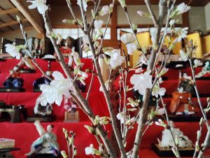 玄関入って右側の大広間に5年ぶりに二組飾られた大正と昭和中期時代の雛人形の傍らに、3月2日にワークショップとして開催される桃の節句のお茶会に向けて用意された枝切りのサクラが1週間ほど前に花を咲かせ、今は七分咲きとなっている。