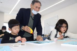 浮き玉の土産品や凧作りなど創作好きの木村巧さん(87)=西浜4=によるワークショップが9日午後、みどりスポーツパークで開かれ、親子連れらが木村さんと協力し作品を完成させた。