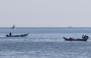 平年よりも6度以上も気温が高かった稚内は朝から穏やかな天候となり、前浜ではノナ(キタムラサキウニ)やナマコ漁の磯船、沖ではナマコの桁船が漁を行い浜は活気付いている。