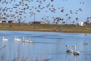 春先は雪融けに水により牧草地帯に池のような水溜りを見ることが出来る。大沼バードハウスに向かう市道左側の牧草地には雪融け水と前日朝まで降った雨により100㍍もある大きな水溜りができ50羽近いハクチョウやマガンなどが羽を休めていた。
