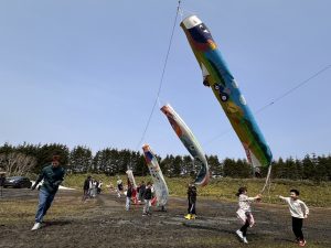 曙地区で牛のぼり 旧小学校Gで揚げる