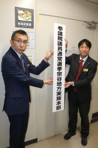 西岡本部長(宗谷総合振興局長)と畠山副本部長(副局長)が「参議院議員通常選挙宗谷地方実施本部」と書かれた看板を掲出し、7月に予定されている選挙に向け万全を期す。