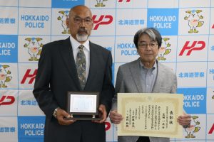 少年補導員連絡協議会表彰として道警本部長・北海道少年補導員連絡協議会長連盟表彰に輝いた吉田一正さん(70)と旭川方面本部長・旭川方面少年補導員連絡協議会長連盟表彰の佐藤裕司さん(66)への表彰状伝達式が2日、稚内署で行われた。