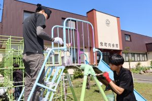 地域貢献活動として毎年各公園でボランティアを行っており、今年で9回目の活動には遠田一洋社長ら社員6人、公園を維持管理する稚内振興公社と市職員5人が参加し、経年劣化し塗装が剥がれていたジャングルジムや滑り台、ブランコなどの遊具、公園回りに設けられた柵などの塗料を塗った。