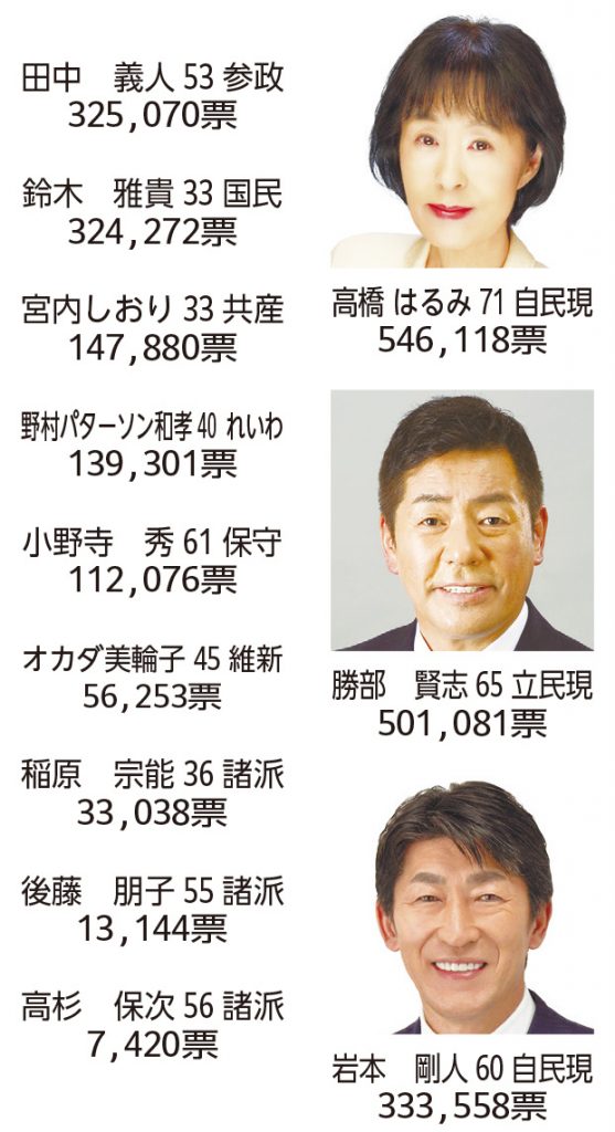 道選挙区(定数3)は早々と高橋はるみ候補(71)=自民党現職=と勝部賢志候補(60)=立憲民主党現職=が当選確実となるも3人目は激戦が続き自民の岩本剛人(60)、参政の田中義人(53)、国民の鈴木雅貴(33)3候補の三巴の戦いとなるも地方票を確実に獲得した岩本候補に翌午前1時過ぎに当確のテロップが流れた。