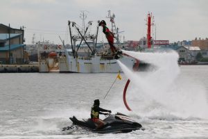 レースの合間、マリンジェットフリースタイルデモンストレーション、フライボードによる演出があり、水上でのパフォーマンスに拍手が送られていた。