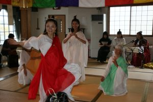 檀家の人らが参加した中、菩薩像の前で山本住職が香語(焼香の際に唱える法語)を唱えたあと、本堂で小嶋さちほさんのライアーと呼ばれる竪琴、山本住職の二胡の演奏に合わせ、有志9人がチベットに伝わるターラ21尊礼賛経の化身となり伝統の舞で犠牲者の冥福を祈った。