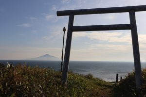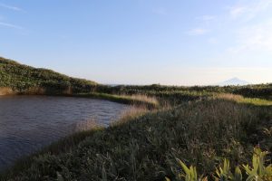 道路脇に立つ白い鳥居から180段ほどの「く」の字のような階段を登ると、赤い屋根が特徴の坂ノ下神社があり、その横には底無し沼と言われ稚内から日本海を隔て30㌔ほど離れた利尻の姫沼につながっているという伝説が伝わる龍神沼がある。
