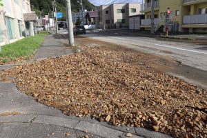 26日夕方にかけての激しい雨の影響で、港3の住宅街では裏山からの土砂が道道のバス通りまで運ばれていた。大雨から一夜明けた27日朝、玄関前に溜まっていた土砂を清掃していた住人は「夕方から夜にかけて激しい雨が降った時、沢水が川のように流れていた」と話していた。