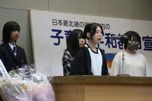 稚内市連合PTA子育て委員会の池野奈穂美さんが子育て平和都市宣言を朗読し、代表児童生徒5人が平和への決意表明をした。
