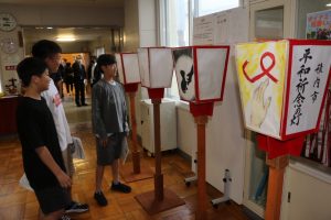 子育て平和の日記念式典が開かれた大岬小で1日午後、市内の小学生らが平和への願いを込めて描いた絵を張った灯籠が展示され、世界の恒久平和を祈念した。