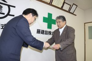 起重船や台船などを所有する藤建設では稚内や利尻、礼文などで港湾工事を施工した際の無事故などが高く評価されたもので、藤田社長は「安全業務が高く評価されて嬉しい。今後も安全第一に工事をやっていきたい」などと述べていた。