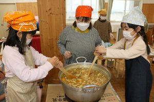 3歳以上の園児たちは、今年9月に上勇知で収穫した勇知いも、園の畑で採れたニンジンなどの食材を切り、炒めるなど手分けして調理した。