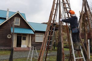 吉永小百合さん主演の映画「北の桜守」の撮影で使用されたメグマ沼のロケセット・北の桜守パークで、冬に備え施設内に植えられいるサクラの木の冬囲い作業が行われている。