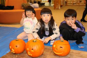 24日夜、市立図書館でカボチャのランタン作りが行われ、家族連れがハロウィン前の催しを楽しんだ。