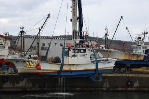 雪が降り始めた今週に入ってから西稚内漁港やノシャップの恵山泊漁港、末広のクサンル川河口横の船溜まり場などで春から夏にかけてナマコ漁などで操業した小型漁船の陸揚げ作業が行われておりクレーン車で漁船を吊り上げては漁師仲間が船に取り付けたロープを引っ張ってバランスを取りながら岸壁横の空き地に陸揚げしていた。