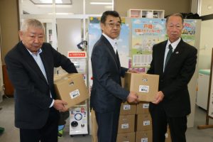 今回は会員39人で一年半かけて貯めたリングプルをダンボールで16箱(128㌔分)を柳浦政春会長、蓑谷克行幹事、梅村俊範社会奉仕委員の3人で市社協に運んだ。