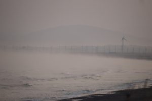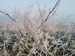 放射冷却現象で25日早朝、声問で氷点下まで下がった。海では霧が湯気のように立ち上がる〝けあらし〟と草木が白く凍りつく霧氷が見られた。