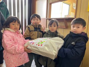 このあと、年長児と先生がお世話になっている稚内消防署、みどりスポーツパークなど6カ所を訪問。稚内プレス社には内山大誠、山口璃乃、山川流生、熊谷李花ちゃんの園児4人と先生が「いつもありがとうございます」と手書きの可愛らしい絵とメッセージが入った果物を届けてくれた。