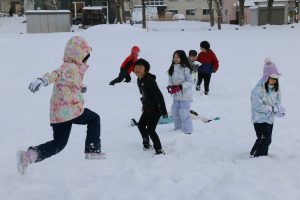 稚内地方にまとまった雪が降った3日、中央小で休み時間にグラウンドに積もった雪で遊ぶ児童たちがいた。