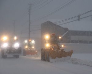 今冬初めてのまとまった雪で、市街地の国道40号や稚内天塩線などの道道、副港通りなど市道幹線道路は今季初めて除雪車が出動=写真。住宅街も10センチ前後の雪が積もり、朝早くから市民が除雪作業に汗を流した。中央地区の男性はスコップを手に「本格的に雪が降り、3月まで雪掻きを頑張らないといけない」、別の人は「湿り雪で雪が重く除雪が大変」と話していた。
