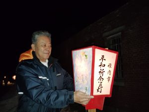 平和願い灯籠を取り付ける富田会長