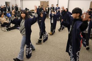 稚内市スポーツ協会の友好都市交流事業として、来市した沖縄県石垣市のサッカー少年団が25日午後、市役所で稚内の子ども達と対面し互いに郷土舞踊を披露し合い交流した。