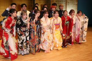 集い終了後、恩師からのビデオメッセージやステージ上で記念撮影するなどし大人への門出を祝っていた。