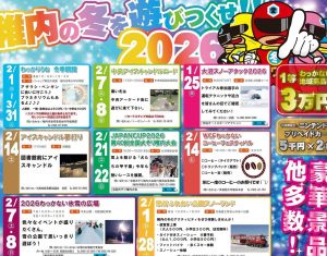 ▽25日午前8時30分=大沼スノーアタック2026▽2月1日~28日=宗谷ふれあい公園スノーランド▽2月7、8日午前10時=2026わっかない氷雪の広場(中央公園・北臨港駐車場)▽14日午後5時=アイスキャンドル夢灯り(図書館)▽7、8日午後5時=中央アイスキャンドルロード(中央商店街)▽14日午前10時=WCFわっかないコーヒーフェスティバル(キタカラ)▽21、22日午前10時=JAPANCUP2026第40回全国犬ぞり稚内大会(大沼特設会場)▽1日~3月8日まで(冬レンジャー対象期間)=わっかりうむ科学館・水族館冬季開館。