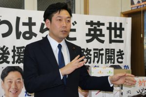 市役所1階に、日本ハムファイターズの山崎福也投手サイン入りのユニホームが展示されている。