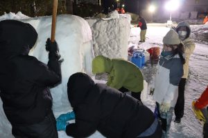 北臨港駐車場には自衛隊員製作の高さ6㍍・延長25㍍の滑り台、中央公園にはとなりのトトロのキャラクター「猫バス」、ポケモンなど雪像10基がお目見え。1週間ほど前から毎日夜、雪像作りをしているというグループは「クオリティーの高い雪像を作りたい」と作業していた。