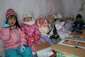 10日午前中、白樺保育所の園児30人が訪れ米袋を使い尻滑りし、かまくらの中に入っては「すごい」と喜んでいた。太田さんが用意したくじ引きも楽しんでいた。