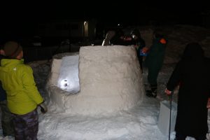 10日夜、開建職員ら10人が集まり、イグルーを作る専用の道具を使い、シャーベット状の雪を半球のドーム型に固める作業を繰り返していた。