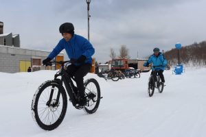 SE―NOのエビナマスジさんと話をする中でイグルー造りなど始めたという稚内開建の池下貴之地域連携課長補佐は「高校生がイベントをやり切れるようサポートしたいと思って参加しました。会場が寂しくならないよう少しでも盛り上げることが出来れば」と寒空下、奮闘している。