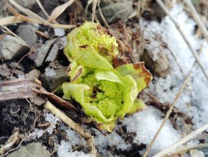 雪融けが進む道路沿いでは春を告げるフキノトウが顔出した。富士見地区の住宅地側で顔出したフキノトウに住民は「今年は雪が少なく、春が来るのが早いかも」と話していた。