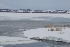 平年より暖かい日が続いたことで、大沼の氷の融解が進み、水門から対岸に向かって100㍍先まで一部で開放面が出ている。今月28日まで冬季開館している大沼バードハウスのスタッフは「暖かい日が続いたとはいえ、2月中に氷が融けて開放面が出たのは初めてではないか」と驚いている。