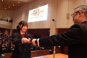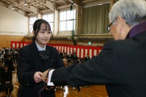 担任教諭から卒業生の名前が呼ばれ、各クラスの代表生徒に卒業証書、修了生に修了証書を手渡した小林洋介校長は「皆さんはこれから新しい世界に踏み出します。社会に出れば誰かと比べられ、結果などを求められる場面があると思いますが、本当に向き合う相手は他者ではなく昨日までの自分です。自分の弱さと向き合い、自分の可能性を信じて一歩ずつ半歩ずつでも前に進んでほしい」などと式辞、白川哲也PTA会長(代読・佐久間政克副会長)が祝辞を述べた。在校生の送辞に対し卒業生を代表し吉川温大君、修了生代表し前田夏愛さんが答辞を述べた。