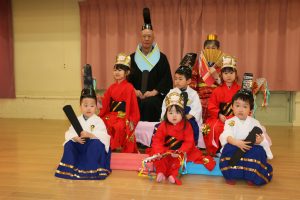 園児たちは先生から「子どもたちが元気に優しく、病気などせず大人になって欲しいと願いを込めてひな祭りをしています」などと由来についての話を聞いたあと、誕生月の園児たちはお雛様とお内裏様に変身し、記念撮影したあと、皆んなで「うれしいひなまつり」を合唱した。