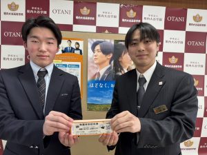 近年はスマホなどで短い動画を見る機会が増え、物語をじっくり味わう体験が少なくなっているとし、武藤はくぜんは大きなスクリーンで映画を観る体験を通して登場人物の想いや人生に触れ命や人とのつながりについて考える機会を届けたいとして、人気俳優の目黒蓮、浜辺美波主演で〝お別れ〟をテーマに全国で大ヒットしている映画に大谷高生100人、稚高生300人を招待することにし、13日午後、大谷高を訪れた担当の武藤孝志さん(23)が2年生の清水遥翔生徒会長にチケットを手渡した。