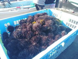 稚内の前浜で1日、ノナ(キタムラサキウニ)漁が解禁され、西浜などに磯船が出漁し初水揚げした。