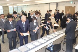 参加した建設業50社の170人を前に、富田建設協会長は「依然として墜落や転落事故、交通事故被害は後を絶たない。私たちが模範となり、日頃から交通事故防止に向けた交通マナーの徹底と思いやり運転を心掛けて頂きたい」などと挨拶。続いて北原開建部長、西岡振興局長、工藤市長、相澤稚内署長、小山稚内労基署長が来賓として挨拶した。