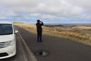 道道入口から車で5分ほど登り坂を進んだ所に、丘陵地帯や宗谷湾、宗谷岬牧場などを見渡せる駐車場があり今季のガイド事業に向け下見で訪れた稚内の歴史など伝える観光ガイド事業所・サウダージ稚内の倉悠介代表は「いよいよ観光シーズン本番。稚内の魅力を伝えるガイドを頑張っていきたい」とSNSに掲載するための写真を撮っていた。